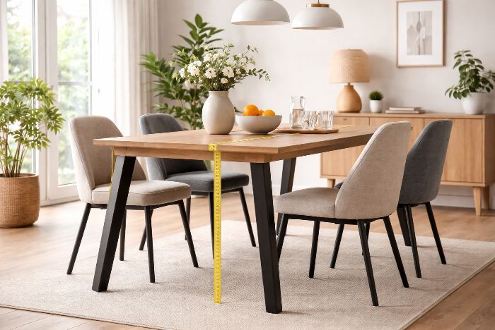 De hoogte van de tafel staat nooit op zichzelf. De stoelen spelen namelijk een net zo grote rol. Eetkamerstoelen hebben meestal een zithoogte tussen ongeveer 43 en 48 centimeter. Dat is zo ontworpen zodat ze goed aansluiten op een standaard eettafel.
